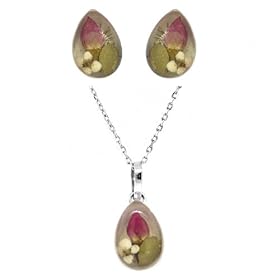 Sterling Silver Pressed Flower Teardrop Earrings and Matching Pendant Set, 16: Jewelry. The pendant offers a sterling silver bail and hangs from a 16-inch cable chain that's secured with a spring-ring clasp. The charming Sterling Silver Pressed-Flower Teardrop Earrings and Matching Pendant Set offers a unique folksy quality for a sweet, handcrafted look. The pendant and earrings feature a teardrop shape made from clear resin with a pink flower and leaves inside. The bright flowers shine through for a fresh, springtime feel and have been pressed by hand demonstrating fine craftsmanship. The earrings have sturdy posts with friction backings that keep them in place.