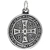 Sterling Silver St. Benedict Round-shaped Medal Pendant, 7/8 inch (23mm) tall: Jewelry. Ipse venena bibas! (Begone Satan! Never tempt me with your vanities! What you offer me is evil. This St. Benedict Medallion is made from Solid Sterling Silver and comes Oxidized to Highlight the Details. On the front of the medal is St. Benedict holding 2 things. He holds, in his right, hand a cross, to which he was incredibly devoted and, in the left, his rule for monasteries. On the back there resides a cross. On the cross are the letters C S S M L - N D S M D, initials of the words Crux sacra sit mihi lux! Nunquam draco sit mihi dux! (May the holy cross be my light! May the dragon never be my overlord!). Also, the word Pax (meaning Peace) can be located on the medal. Surrounding the back of the medal are the letters V R S N S M V - S M Q L I V B, refer to Vade retro satana meaning Vade retro Satana! Nunquam suade mihi vana! Sunt mala quae libas. Drink the poison yourself!).