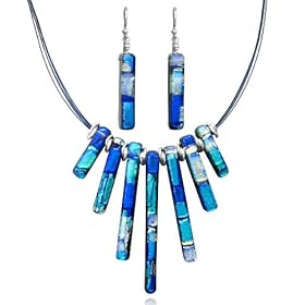 Sterling Silver Dichroic Glass Blue Bar Necklace and Earrings Set, 18: Jewelry. Slender glass bars employ multiple layers of metal oxides to produce a pattern of mixed silvers and vibrant blues. Illuminate your style with this gorgeous dichroic glass bib necklace and matching drop earring set. The glass bars are paired with sterling silver spacers and threaded on a multi-strand, nylon-coated stainless steel wire to form the necklace.