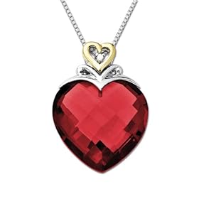 Sterling Silver and 14k Yellow Gold Created Ruby Heart Pendant, 18: Jewelry. Resting below a classic 18-inch box chain is a sparkling heart-shaped created ruby stone with a checkerboard finish that reveals magnificent sparkle. She'll make a trendy statement in the bold Sterling Silver and 14k Yellow Gold Created Ruby Heart Pendant. The stone is topped with a crown like display of 925 sterling silver and a 14k yellow gold heart, accented in the center with a created round diamond stone.
