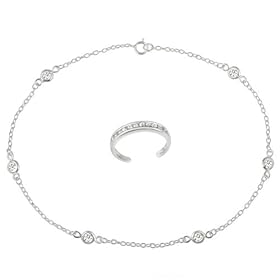 Sterling Silver Cubic Zirconia Toe Ring and Chain Anklet with Cubic Zirconia Stations, 10: Jewelry. The toe ring displays 11 round, white cubic zirconia set in polished sterling silver. Adding serious sparkle to your summer days is easy with the Sterling Silver Cubic Zirconia Toe Ring and Anklet. This glittering display comes as a matching set featuring a silver-toned, 925 sterling silver toe ring and anklet. The matching anklet features six round, white cubic zirconia, evenly spaced to add shimmer and sparkle to all sides of the silver-toned 10-inch rolo chain.