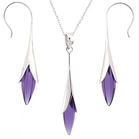 Silver Swarovski Crystal Purple Amethyst Birthstone Necklace Earrings Jewelry Set in Gift Box Bucasi SALE: Jewelry. The set come complete in a Bucasi gift box. Amethyst February Crystal Birthstone Sterling Silver Necklace and Earring Set. Sleek, smooth, sophisticated. The name Amethyst is symbol of peace and happiness since ancient times. The amethyst stone has long been a favorite among royalty. These richly hued stones are prized for their ability to calm the mind and awaken the spirit. This stunning necklace with pendent and earring set is handmade with a purple crystal and set in .925 sterling silver. The silver is rhodium plated and is tarnish free. Necklace measures: 16 inch and Dangle Earring Measures: 2.0 inch Length. Exclusively from Bucasi.