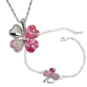 18k Gold Plated Swarovski Crystal Heart Shaped Four Leaf Clover Pendant Necklace and Bracelet Set - Pink Sapphire: Dahlia: Jewelry. This set can also be purchased individually: Pendant Necklace - Pink Sapphire(ASIN: B005ZFXVX8), Chain Bracelet - Pink Sapphire(ASIN: B005ZFXYFI)*This set is not a Swarovski brand product.*****A free beautifully designed Dahlia jewelry box is included for an impressive gift presentation. As four leaves clover symbolizes good luck, this set is further designed with heart shaped leaves in wishing wearer the best luck with all your heart. It makes a perfect gift to your mother, valentine, and siblings.*****This set is accented with real heart shaped Swarovski crystals and small Czech crystals. With patent protected facet cuts, Swarovski crystals are optimized to be the most brilliant and are much more expensive than other crystals. Swarovski Crystals used in this set have far more facets than other crystals and reflect glamorously. *****This set is made of cooper and plated with 18K white gold to add resistance to tarnish. Even if copper is a lot more expensive than other white base metals such as iron, lead, nickel, zinc, etc., it enables intricate and delicate jewelry making while others don't. *****The mirror surface on this set has sleek and glamorous reflections and adds a luxurious fine jewelry look. It's accomplished through intricate steps which can only be done by highly experienced workers. ***** The pendant measures 0.87 inch wide and 1 inch high and the necklace is 16 inches long with a 2 inch chain tail so that you can adjust the length of the necklace to fit you. The bracelet is 6.5 inches long with a 1 inch chain tail so that the bracelet can adjust to the wearer's wrist. Besides 30 day no-question-ask return policy, Dahlia also offers Quality Guarantee to ensure your risk free shopping experience (Restriction applies, see our website for more details).