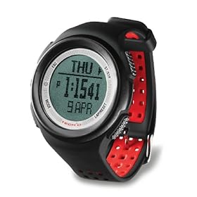 Tech4o Traileader 1 - Watch: Sports & Outdoors. Other details include a recessed lens designed for the long haul, a 50-lap chronograph, six timers, and two alarms. The Tech4O Traileader 1 may look like a watch, but it works like the ultimate survival tool, packing everything you need to navigate the wildest of wild places within a compact, rugged stainless-steel case. The accuracy of the Traileader 1 stems from its accelerometer sensor, which detects changes in the user's movement (acceleration) and then translates them into varying degrees of electric current within the sensor. Next, the watch decodes these electrical currents into highly accurate measurements of speed and distance and displays them on the watch face. Accelerometer sensors are commonly found within a diverse range of industrial products in which accuracy is critical to performance, including airbags and tilt meters. The Traileader 1 does more than just track speed and distance, however, with sophisticated instruments that determine your pace, calories burned, steps, and total time. Plus, the watch records a fully adjustable personal profile--helping you develop custom training routines--and offers an ultra-reliable 10-day memory function that tracks your progress in the short term. The Traileader 1 is also equipped with a number of instruments for hiking and climbing, including an altimeter, barometer, and digital compass. The altimeter measures your current altitude, reference altitude, and ascent/descent rates, while offering such features as a 48-hour altitude graph, a 24-hour maximum and minimum altitude indicator, and altitude alarms. The barometer, meanwhile, gauges the current pressure and temperature, with a weather forecaster and 48-hour pressure graph thrown in for good measure. And the digital compass is a must for back-country trips, with such features as a 1-degree increment resolution, an adjustable declination, a bearing lock, and a distortion warning. Equipped with a ventilated polymer band, the Traileader 1 carries a one-year warranty.