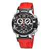 Tissot T-Race Mens Watch T048.417.27.057.01: Tissot: Watches. Water resistant at 100 meters/ 330 feet. Stainless steel case with a red rubber strap. Fixed bezel. Black dial with luminous hands and index hour markers. Arabic numerals mark the 6, 9 and 12 o'clock positions. Minute markers. Tachymeter scale around the outer rim. Date display appears at the 3 o'clock position. Chronograph - three sub-dials dispalying: 1/10th of a second, 30 minutes and 60 seconds. Quartz movement. Scratch resistant sapphire crystal. Case diameter: 43 mm. Deployment clasp. Functions: hours, minutes, seconds, date, chronograph, tachymeter.