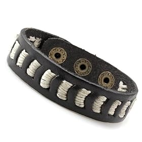 Trendy Mens Black Leather Cosmopolitan Indian Bracelet Cuff: Jewelry. Add a touch of style to your look with this trendy bracelet, featuring entwined stripes of whitewash string on Goth black leather.