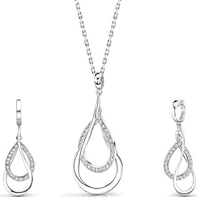 Unforgettable Beauty: Sterling Silver Rhodium Finish Pendant Necklace Earrings Set with Cubic Zirconia: peora: Jewelry. Dimensions: Pendant: Length: 2 1/4 inches x Width: 7/8 inch and weight: 6.60gms. Surrender to elegance, capture the moment and embrace your transformation. This gorgeous Pendant necklace Earrings set is crafted from genuine .925 Sterling Silver Rhodium Finish. A dual pattern twirled teardrop design showcases dazzling White Cubic Zirconia gemstones gleaming with a high polished White Gold finish. The pendant comes with an 18 inch Box Chain secured with a spring ring clasp. The earrings have an easy to wear, popular Huggie Hinged-hoop closure. Earrings: Length: 2 1/8 inches x Width: 3/4 inch and weight: 10.50gms.
