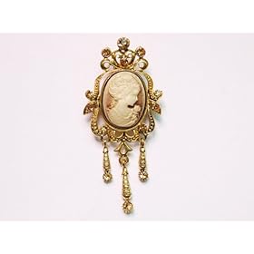 Vintage Inspired Detail Dangle Beautiful Topaz Rhinestone Cameo Lady Pin Brooch: Jewelry. She is taking in the scent of a rose. This beautiful brooch is designed in the shape of an elegant vanity mirror. At its center is featured a light brown/peach cameo. The maiden looks shy and poised. Surrounding the cameo are intricate designed and enhancements made with topaz crystal rhinestones.