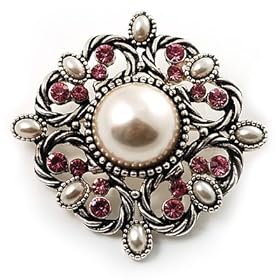 Wedding Corsage Faux Pearl Crystal Brooch (Antique Silver): Jewelry. Featuring a pretty corsage design, crafted in antique silver finish, decorated with snow white faux pearls and accented with pink crystals for a sparkling finish. Add a stunning finishing touch to your outfit with this eye-catching Wedding Corsage Faux Pearl Crystal Brooch. It measures 53mm x 53mm and fastens with a flag pin and revolver clasp.