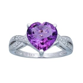 10k White Gold Amethyst and Diamond Ladies Heart Ring, Size 7: Jewelry. The center of the ring holds a heart-shaped bright purple amethyst in a dainty three-prong setting. For an accessory that will always be in style, choose the 10k Gold Amethyst and Diamond Ladies Heart Ring. Made from rich 10k white gold, the ring offers a versatile silver-toned finish that is modern and chic. The twisted band is cut in a knot-like design and is set with double rows of tiny white diamonds of IJ color and I1-I2 clarity. With a total of 3.15 carats, the ring makes a stunning choice for a February birthstone or special-occasion gift.
