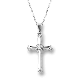 14k White Gold Cross with Diamond-Accent, (0.375 cttw), 18: Jewelry. Resting from a classic 18-inch rope chain is a 0.79-inch wide pendant that is crafted in bright 14k white gold. A classic gift for any religious occasion or even a birthday, the 14k White Gold Cross with Diamond-Accent is always in style. The center of the pendant contains a crisscross wrapping of white diamond stones.
