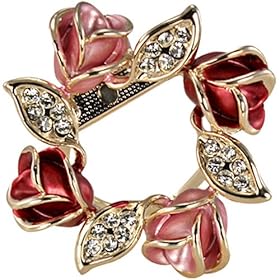 Rose Wreath Crystal Rhinestone Gold-Tone Brooch Pin - Pink: Dahlia: Jewelry. The brooch has a heart-shaped snap clasp with a back pin on the side. This adorable rose ring is constructed with a wreath of cute rose buds decorated with authentic Austrian crystals. This brooch measures 1.6 inches long by 1.6 inches wide and weighs 20 grams. This cute brooch will add a sparkling flair to your jacket lapel or scarf.