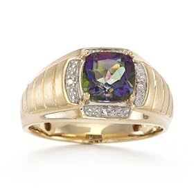 Mens 10k Yellow Gold Mystic Fire Topaz and Diamond Gents Ring (0.02cttw, G-J Color, I2-I3 Clarity), Size 10.5: Jewelry. The diamonds have a total carat weight of .02 along with a G-J color rating and I2-I3 clarity rating. For an eye-catching design that shows off your sense of style, the 10k Yellow Gold Mystic Fire Topaz and Diamond Gents Ring features a cushion-cut mystic fire topaz as the focal point. The faceted surface of the gemstone glimmers with mysterious blue, green, and gray tones. It is surrounded on all four sides by sparkling round diamonds. The wide band is made from 10k yellow gold for a classic, warm tone while the ridges along the sides add texture and flair.