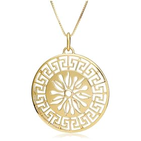 18k Yellow Gold Plated Sterling Silver Sun Medallion, 18: Jewelry. This dramatic pendant is 45 millimeters high by 37 millimeters in length and hangs from an 18-inch sterling silver frozatin chain that closes with a spring-ring clasp. This sterling silver with 18-karat gold overlay sun medallion is ideal for the woman who likes her jewelry to complement her individuality.