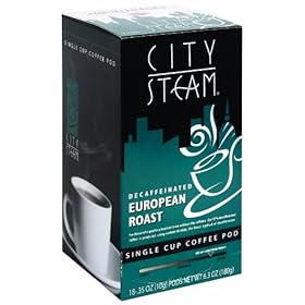 City Steam 17525 Decaffeinated European Roast Single Cup Coffee Pods, 18-count: Kitchen & Dining. From our full-bodied 100-percent Colombian blend, our French Roast or our decaf, City Steam Single Serve Coffee will brew a perfect single cup of coffee every time. City Steam Gourmet Single Serve Coffee Pods are available in a wide selection of blends, roast colors and flavors imported from around the world. Our coffee pods contain filter paper and are packed in foils to preserve freshness.