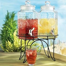 2 Glass Beverage Dispensers on Stand: Kitchen & Dining. Made of transparent, hammered glass, the exteriors have a nice textured appearance, with polished silver colored spigots. Serve complementing drinks at your parties side by side with this two beverage dispenser and stand set.