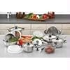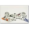 28pc 12-Element Stainless Steel Cookware Set: Kitchen & Dining. Each pan is made from beautifully polished surgical stainless steel together with stainless steel capped riveted handles for durability and performance that will last a lifetime. This set does it all! Now you can have the perfect pan for any cooking job and the right accessories to help you prepare meals like a professional chef. The unique temperature knob on each cover tells you when you have reached the optimum temperature for healthy and nutrient saving waterless cooking. More than high quality cookware, each accessory offers greater efficiency and usefulness. The stainless steel bowls can also be used as double boilers or even as dome covers for stove top roasting. The handy step-steamer lets you steam just the right quantity of vegetables because it fits the saucepan and four sizes of casseroles. Set includes: 1.6qt Saucepan with Cover, 1.6qt Casserole with Cover, 2.2qt Casserole with Cover, 3.1qt Casserole with Cover, Step Steamer with Side Handles, 6qt Casserole with Cover, 10-7/8 inch Frypan with Cover, Large Mixing Bowl with Air Tight Plastic Cover, Medium Mixing Bowl with Air Tight Plastic Cover, Grater with Removable Handle, Grater Ring Adapter, Deep Fry Basket with Removable Handle, Suction Cup Knob for Mixing Bowls when Used as a Dome Cover, Heat Resistant Pan Rest, and 4pc Measuring Spoons.