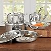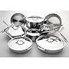 All-Clad 5000-9 Stainless 9-Piece Cookware Set: Kitchen & Dining. The set includes a covered saucepan, covered saut¿ pan, frying pan, covered casserole pan, and a covered stockpot, and can be used to make just about any dinner or delicacy. The bestseller among All-Clad's renowned cookware collections, the Stainless line provides serious and professional cooks all the virtues that make All-Clad's worldwide reputation unsurpassed. Key to its high performance is a three-ply, bonded construction. Sandwiched between layers of stainless steel is a thick core of pure aluminum that spreads heat evenly across the bottoms of pots and pans and all the way up the sides. The interior is highly polished 18/10 stainless steel, so it's stick-resistant as well as stain- and corrosion-resistant. The exterior is gleaming, magnetic stainless steel that works on induction as well as conventional stovetops, and, with care, remains beautiful during this cookware's lifetime warranty against defects--and beyond. This nine-piece set of Stainless cookware consists of a 10-inch fry pan, a 2-quart covered saucepan with lid, a 3-quart covered sauté pan, a 3-quart covered casserole pan, and a 6-quart covered stockpot. Polished 18/10 stainless-steel pan and lid handles are riveted for strength and grooved on the top for comfort. The pans' long handles (holed for hanging on hooks or pegs) stay cool on the stovetop but won't be harmed by an oven's highest heat. Although Stainless cookware is dishwasher-safe, hand washing is recommended. --Fred Brack What's in the Box 10-inch fry pan, 2-quart covered saucepan with lid, 3-quart covered sauté pan, 3-quart covered casserole pan, 6-quart covered stockpot From the Manufacturer All-Clad Stainless Construction Each piece of All-Clad cookware features a unique metal bonding construction. All-Clad Stainless cookware sandwiches a thick core of three separate layers of aluminum between an easy-to-clean, highly polished 18/10 stainless-steel cooking surface and a magnetic stainless-steel exterior. The aluminum core retains heat and evenly distributes it along the bottom and up the sidewalls of the cookware. The stainless interior is stick-resistant and cleans easily. The magnetic stainless-steel exterior gives the cookware a gleaming finish. All-Clad Stainless also features the company’s signature stay-cool inch long handles, lids fashioned from gleaming 18/10 stainless steel, and highly durable stainless-steel rivets. All-Clad Stainless cookware is one of five collections from All-Clad Metalcrafters. Designed to work on conventional gas and electric ranges, as well as induction cooktops, All-Clad Stainless cookware is the best-selling collection in a full line that includes All-Clad LTD, Cop-R-Chef, Master Chef 2, and Copper Core. Features and Benefits All-Clad pans with a stainless interior cooking surface are oven-safe up to 500 degrees. All-Clad pans with a non-stick cooking surface are oven-safe up to 400 degrees, but should not be used under the broiler. We recommend using a low to medium temperature when cooking with All-Clad. Higher heats are not necessary and may cause discoloration (see cleaning instructions below). Other features include: Beautifully polished, magnetic stainless exterior layer. Pure aluminum core that not only covers the bottom of the pan but also extends up the sides. This allows for great heat conductivity as well as an even heat distribution so you won’t have hot spots inch when cooking. Stainless-steel interior layer/cooking surface. Long, polished stainless, stay-cool handles. Sturdy, non-corrosive stainless-steel rivets won't react with foods. Polished stainless-steel lids fit evenly with the pan’s edges to seal in flavor of your foods. The All-Clad Stainless collection is compatible with an induction stovetop (with the exception of a few pieces) in addition to gas and electric stovetops. The Stainless collection is dishwasher-safe, excluding pieces with a nonstick cooking surface. Warranty Fry, saute, boil, simmer, and more with style and grace, and stop worrying about which cooktop you're using with this flexible and high quality nine piece cookware set All-Clad. Attractively designed and incredibly tough, this chef's pan is constructed of three layers of metal; two stainless steel outer layers with an aluminum core. The stainless steel exterior combined with the aluminum core allows the pot to be used on all types of stovetops, including induction, and heats it evenly to eliminate hot spots. Inherently stick-resistant, food is served easily and clean up is a breeze. The classically sloped sides help prevent messes, and the long handles have grooved tips for convenient hanging storage, while the short handles are easy to grasp. All handles are stay-cool and riveted to the sides for extra strength. Producing some of the finest cookware in the nation, All-Clad has been featured in many high class and gourmet restaurants for its superior performance and aesthetically designed pieces crafted from American artists using the finest metals.
