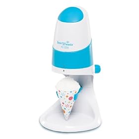 Back to Basics SIT10823 Ice Treats Electric Ice Shaver: Kitchen & Dining. Other highlights include large push-button operation for easy use, a removable cone holder that keeps cups in place under the shaving blade, and a built-in drip tray that contains drips and spills for quick clean-up. No need to wait for the State Fair to enjoy a refreshing snow cone thanks to this easy-to-use electric ice shaver. The machine can be used with regular ice cubes or the included ice molds, and its sharp shaving blade quickly transforms ice into fine, fluffy snow--adjust the blade as necessary for creating the texture of ice desired. Make a variety of favorite snow cones or other delicious summertime treats by adding flavored syrups, fruit juices, soda, or punch-flavored drinks to the shaved ice. Because of its snowy fine consistency, the shaved ice absorbs flavors instead of them running to the bottom. The shaved ice can also be mixed with fruit and yogurt for a healthy snack. Accessories include two ice molds, four snow-cone cups, four spoon-straws, and a user manual with recipes.