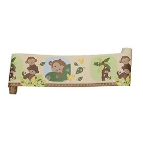 Bedtime Originals Curly Tails Wallpaper Border: Baby. This bright and colorful collection comes complete with a wooden lamp, oversized wall décor, coordinating musical mobile, wallpaper border and window valance. Our faux fur monkeys are at play amongst the palm fronds and a sweet yellow songbird joins in the fun.