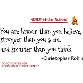 You are braver than you believe, stronger than you seem, and smarter than you think Winnie the Pooh Christopher Robin wall art wall sayings: Baby. By applying your favorite sayings directly to your walls you will create daily inspiration with a beautiful hand-painted look. ****Purchase from Epic Designs to get your free bonus peel and stick sticker. Make sure you receive this bonus item to ensure you are ordering directly from Epic Designs. We cannot gaurantee the accuracy of this product if purchased from another seller.****Wall sayings and designs are the latest trend in interior decorating and home decor. It is an easy and creative way to add personality and charm to Any Room! Vinyl Lettering is a creative way to transform any room into a stylish, unique space. The graphic is ready to apply and is cut from high quality Avery vinyl film with a outdoor life of 6 yrs and should last for a very long time indoors (25+yrs.).