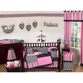 Pink and Black Madison Girls Boutique Baby Bedding 9pc Crib Set: Baby. The gorgeous color palette of pink, black and white will set your nursery up in high style. The Madison 9pc. baby girls bedding collection by JoJo Designs creates a stunning boutique setting for your little fashionista. This designer girl crib bedding set uses a sensational collection of JoJo exclusive 100% Cotton and Chenille fabrics. It has a black and white scroll print, a bold designer stripe, mini black and white polka dot print, and soft minky swirl chenille. Now you can create a high-end boutique nursery at an affordable price.