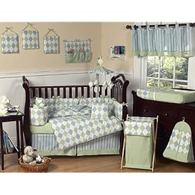 Blue and Green Argyle Baby Beddings 9pc Crib Set: Baby. JoJo Designs creates various coordinating room accessories for all of their children's bedding sets including mobiles, lampshades, changing pads, and wall decor. JoJo Designs Blue and Green Argyle 9 pc baby bedding ensemble has all that your little one will need. This modern baby bedding set uses exclusive JoJo Designer coordinating 100 percent cotton prints. The 3 prints are made in a color palette of soft blues, green, and white. They include a detailed large argyle, a stimulating stripe, and a mini argyle print. This set will create a stylish room that your little one is sure to enjoy. JoJo Designs exclusive modern Argyle bedding set fits all cribs and toddler beds.