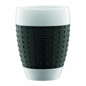 Bodum 2-1/2-Ounce Pavina Porcelain Cups with Silicone Grip, Black, Set of 2: Kitchen & Dining. The silicone sleeve functions as a grip while simultaneously protecting your hand from excessive heat and adding a splash of vivid color to your dining and drinking experience. The Bodum Pavina Porcelain Cups are not only practical, they also make a statement. The Bodum Pavina Porcelain Cups are made of porcelain and silicone and all parts, including grip, are dishwasher safe.