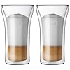Bodum Assam Double Wall Glasses 8 oz, Set of 2: Kitchen & Dining. Their unique double wall design creates a highly effective layer of insulation that keeps hot drinks hot without burning your fingers and cold drinks cold without the messy condensation. Our Assam double wall glass collection is a design innovation. These (0.4 l, 8 oz.) glasses are made of ultra-light, heat resistant, mouth-blown borosilicate glass. The glasses are available in a variety of sizes to perfectly frame espressos, cappuccinos, beer and iced drinks, forever eliminating the need for a coaster.