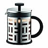Bodum Eileen 8 Cup French Press Coffeemaker, 1.0 l, 34-Ounce: Kitchen & Dining. For easy cleaning, the carafe and all its parts go right into the dishwasher. The Eileen coffee press is a tribute to designer Eileen Gray and is built to withstand the rigors and crowds of a cafe in Paris--the city that Gray loved most. Bodum instills quality craftsmanship in this press and the result, according to coffee purists, is a brewing machine that produces a superior taste and aroma to any electric coffeemaker. The secret is that the grounds are able to steep in boiling water for about four minutes before they are pressed with the plunger, producing a richer, full-bodied flavor. The heat-resistant glass carafe on this Eileen model holds a maximum of 32 ounces or 8 cups of brewed coffee or tea, making it a useful size for all-day-long drinkers. The stainless-steel frame encases the carafe and protects it from breakage while still allowing coffee drinkers to see their rich coffee through the slotted design. The santoprene-coated square-shaped handle provides a firm grip on the press while pouring and the stainless-steel lid and plunger are durable and will hold up to years of brewing. Replacement parts are available from the manufacturer.