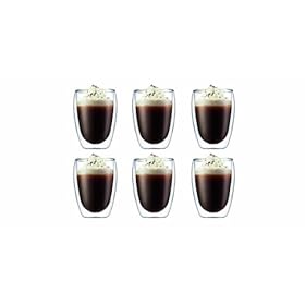 Bodum Pavina 12-Ounce Double Wall Thermo Tumbler Glass, Buy 4 Get 6 Bonus Set: Kitchen & Dining. The walls of each vessel sport two layers of clear glass that create a dramatic optical illusion of liquid suspended within, while at the same time resisting heat and preventing condensation - leaving them comfortable to hold and safe for placement on any tabletop or counter. Bring a unique and trend-forward look to the table with this set of 6 12-ounce glasses. Intricately handcrafted of mouth-blown borosilicate glass - the same material used to make scientific lab equipment - the glasses offer durable, temperature-safe construction that holds both hot and cold drinks at their optimal temperature longer than traditional drinkware, making them an ideal choice when serving wine, beer, coffee, tea, and even kid-friendly beverages such as milk, juice, or hot cocoa. Furthermore, their smoothly rounded profiles and low statures fit perfectly in the hand and make it a pleasure to enjoy everyday dining, special-occasion hosting, and everything in between.