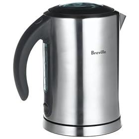 Breville SK500XL Ikon Cordless 1.7-Liter Stainless-Steel Electric Kettle: Kitchen & Dining. Other highlights include a cushion-controlled lid that opens with the press of a button, a viewing window in the lid, a ready inch bell indicator, a removable scale filter, a soft-grip open-style handle, and convenient cord storage. Equipped with a 1500-watt immersed heating element, this electric kettle quickly brings up to 1-2/3 liters of water to a rolling boil. To use, simply fill the kettle using the LED-illuminated water-level indicator to gauge how much, return it to its power base, and flip the switch to the on inch position. In about two minutes, hot water will be ready for anything from tea, instant coffee, and hot cocoa to instant soup or oatmeal. The kettle lifts off its power base for graceful serving without the hassle of a cord and can be returned at any angle. For safety, the kettle automatically shuts off when water reaches a full boil, and its boil-dry protection won't allow the unit to operate without water inside.