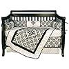 Bundle-21 Versailles Crib Bedding Set in Black and White (5 Pieces): Home & Kitchen. Includes: -Set includes bumper set, coverlet, skirt, crib sheet, window valance, diaper stacker, hamper set and 3 pieces bin. [***INCLUDED IN THIS SET: (1)Versailles Black and White 4 Piece Crib Set, (1)Versailles Black and White Hamper Set, (1)Versailles Black and White Bin 3 Piece Set, (1)Versailles Black and White Diaper Stacker, (1)Versailles Black and White Window Valance] Features: -Versailles black and white filigrees reminiscent of vintage damask wallpaper are printed on a soft white cotton for a sophisticated nursery.-4 Separate bumpers to fit any crib.-Framed coverlet that is a useful crib blanket.-Diamond print 100pct cotton percale sheet with deluxe 10'' pocket.-15'' Box pleat skirt.-Trend Lab will replace any defective merchandise within 30 days of original purchase. Color/Finish: -Color: Black and White.-Beautiful oversized embroideries on the coverlet and bumper are accented with a diamond print and crisp mini-waffle pique trims.
