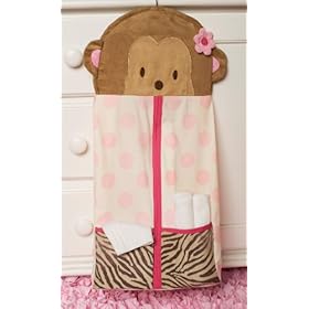 Carters Jungle Jill Diaper Stacker: Baby. A pink polka dot and zebra fabric storage pocket stores up to 3 dozen diapers away and out of sight, helping to organize and tidy your nursery. A curious brown faux suede monkey peeks over the top of this Jungle Jill Diaper Stacker. Measuring 12 inch x 26 inch and 9 inch deep, the 90% cotton and 10% polyester, exclusive of decoration, the diaper stacker is super convenient and easily hangs from the top.