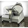 Chefs Choice 662 International Professional Electric Food Slicer with 8.6-Inch Diameter Blade: Kitchen & Dining. Made of die-cast metal, the slicer weighs 29 pounds and measures 19.3 inches wide, 14.6 inches high, and 14 inches deep. Heavy, rugged, and powerful, this commercial-quality food slicer has a large carriage and tilted design to handle big hams, roasts, and blocks of cheese with speed and ease, as well as small vegetables, luncheon meats, and crusty bread. The 180-watt induction motor operates quietly, and the carriage travels smoothly on industrial ball bearings. Users can clean the slicer's 8.6-inch surgical stainless-steel blade while it's in place, or, when more thorough cleaning is necessary, can remove it safely with a Plexiglas tool that features big thumb screws that attach to the blade and then serve as handles to lift the blade free. Accompanying the slicer is a detachable grinding wheel sharpener. (Detailed sharpening instructions are included.) A thickness adjustment knob calibrated in millimeters permits slicing from paper thin to about .6 inch. Safety features include a double switch system, where one switch turns the unit and the other switch, spring-loaded for additional safety, operates the blade; an indicator light that serves as a reminder when the blade is rotating; thick Plexiglas guards on the carriage and the food pusher; and a switch that prevents the slicer from operating if the blade guard is not properly in place. It comes with a plastic serving tray.