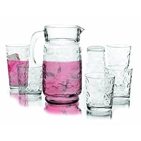 Circleware Circle 17 Pc Beverage Set: Kitchen & Dining. They combine centuries-old artistic hand-crafted European and Mediterranean styles with up-to-date technology and design elements in their wide range of glassware and drinkware. A great set for any home, bar or restaurant, this entertaining set is designed using Circleware's Circle style. Circle design offers a textured circle pattern on the outer surfaces. These sturdy glasses are dishwasher-safe for easy cleanup and make an attractive contemporary addition to your kitchen or bar. This set includes eight 17-ounce Cooler glasses, eight 12-ounce DOF glasses and one 70-ounce glass Pitcher. This pitcher holds up to 70 ounces of liquid and has an ergonomic handle allowing for easy pours. Circle Glass is dedicated to bringing you the very best in classic contemporary glassware styles. With a continuously updated collection of styles and an ever-growing product line Circle Glass is sure to have something to suit every kitchen.