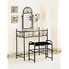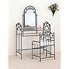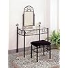 Coaster Glossy White Metal Makeup Vanity Table Set with Mirror in Mauve Velour: Furniture & Decor. The stool is upholstered in velour fabric in a soft mauve color, and the metal frames of both table and stool are finished in white. Create your very own cosmetic corner with this Vanity Table Set by Coaster. This stylish personal table features a swiveling mirror and two glass shelves to hold a variety of products and accessories. Its real charm comes from the gorgeous porcelain hearts fixed into the metal frames of the vanity and stool and decorated with delicate paintings of flowers. Pamper yourself in style with this beautiful vanity table set by Coaster.
