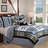 Come Sail Away Nautical Childrens Bedding 3pc Full / Queen Set: Home & Kitchen. The matching shams use a blue and white pin stripe border and a final navy coordinating border. Come Sail Away Gorgeous 3 pc. Queen Bedding Ensemble has all that your little sailor boy will need. The nautical theme of this charming set fills the quilt and accessories with beautifully embroidered helm wheels, anchors, boats, and lighthouses. It is all set upon a Chambray blue background with white, red, navy, and yellow gingham accents, as well as blue and white striped finishing touches. The quilt is constructed with chambray and white squares bordered with a blue and white striped fabric. The final border around the quilt is Chambray as well. Inside the squares of the quilt are anchors and boats. In the center of the quilt is a large and beautifully detailed embroidered lighthouse. Matching shams use the chambray material in the center with a large embroidered helm wheel of yellow gingham with red and navy accents. This set is truly stunning..