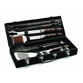 Cuisinart 10-Piece Premium Grilling Set: Patio, Lawn & Garden. These durable stainless steel tools with wooden handles fit comfortably in your hands and bring a touch of style to your grilling area. The Cuisinart 10 Piece Premium Grilling Set features all the tools any grill master needs to manage your savory steaks, juicy burgers, succulent fish and fresh vegetables. Set includes Chef's Spatula, Grill Tongs, Grill Fork, Set of 4 Skewers, Grill Brush and 2 Replacement Grill Brush Heads.