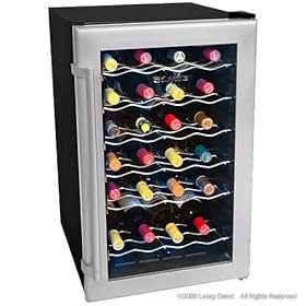 Deluxe 28 Bottle Wine Cooler Refrigerator: Appliances. This thermoelectric wine cooler features a premium metallic silver finish door trim with double paned tempered glass. Store up to 28 bottles of your best wine under optimum conditions in this EdgeStar Thermoelectric Wine Cooler. While your wine enjoys the optimal temperature and humidity conditions within this wine cooler, you get a wine cooler in one of the most stylish finishes available. The tinted glass door protects your wine from harmful light, plus the door features a pro-style towel bar handle.