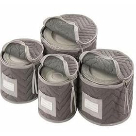 China Dinnerware Storage Deluxe Microfiber Protects: Home & Kitchen. Save your dishes from nicks and scratches with these protective cases! Hand washable with a mild detergent. Protect your dishes in this set of 4 plate storage containers. Any type of dish, from the finest China to seasonal dishes can benefit by the use of these protective storage bags. The quilted Microfiber fabric is sturdy and soft, ideal for china storage. Included in this set are 12' Dinner Plate Case, 9.5' Salad Plate Case, 8' Dessert Plate Case and a 7' Saucer Case. Each case comes with 8 cushioned dividers. ? These storage sets do not unzip all the way around, however they do unzip approximately 3/4 of the?way and the fact that these cases are soft and pliable makes it easy to insert china.
