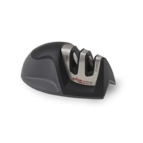 Edgeware Edge Grip 2 Stage Knife Sharpener: Kitchen & Dining. Two stages of sharpening offer the capability to put a razor sharp edge on very dull or damaged blades and touch-up already sharp blades. Edgeware Grip 2-Stage Knife Sharpener is lightweight, portable, and easy to use on either a flat surface of the edge of your countertop or table. Carbide blades and crossed ceramic rods features pre-set sharpening angles that provide the proper sharpening angle every time. Carbide blades (Coarse) provide quick edge setting capabilities, and the ceramic rods (Fine) are used for the final edge honing. It comes with non-slip rubber feet and a soft grip rubber handle for comfort and steadiness when sharpening.