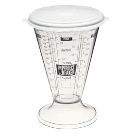 Emsa Perfect Beaker with Seal: Kitchen & Dining. Measurements include pints, cups, ounces, ml/ccm, tablespoons, and teaspoons, and all are written clearly in black print. This is a single measuring cup that will replace the others floating around your kitchen--even the teaspoons! Cone-shaped, with a sturdy base and tight-fitting lid, this little beaker is perfect for those recipes with odd amounts, such as two cups plus one tablespoon. There's a lip around the top edge that acts beautifully as a spout--no dripping when pouring liquids, from water to beaten egg yolks. The lid fits snugly enough that you can snap it on and shake the beaker for easy mixing of ingredients.