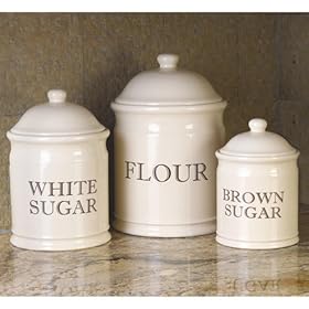 English Bakers Stoneware Canister Set: Home & Kitchen. each. Sized for serious bakers, this English baker's canister set stores the basics in generously-sized airtight containers. Handcrafted, glazed stoneware is sealed with a silicone gasket and labeled for quick identification. Wide mouth opening for easy filling and cleaning. Flour and sugar hold 10-lb. Brown sugar canister holds 3-lb.