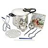 Fagor Futuro 5-Piece Pressure-Cooker Set: Kitchen & Dining. Visual pressure indicator on handle shows when all pressure has been released from cooker Spring-type mechanism with two pressure settings: LOW (8psi) and HIGH (15psi). The Fagor Futuro model is the ultimate in the evolution of the pressure cookers. It comes complete with two short handles for easy storage, an automatic locking lid for added convenience, and an easy-cleaning valve. The 6-piece set includes: 4 quart 18/10 stainless steel & 6 quart 18/10 stainless steel Futuro nesting pots (6 quart pot fits inside 4 quart pot for easy storage), Futuro Pressure cooker lid (fits both pots), Tempered glass lid (fits both pots), stainless steel steamer basket which doubles as a food grater and support trivet, instruction manual and “Tastefully Under Pressure” full color cookbook with over 90 delicious recipes. Exclusive triple valve safety system plus safety lock on handle prevents opening before all pressure is released. Works on all types of domestic stovetops: gas, electric, ceramic and induction.