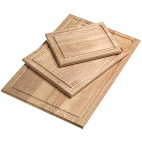 Farberware 3-Piece Wood Cutting Board Set: Kitchen & Dining. Made of farm-grown hardwood (no forest trees involved), the 5/8-inch-thick boards are sealed with food-grade mineral oil so they won't dry out. With grooved channels to catch juices for making sauces and, these three inexpensive cutting boards are ideal for carving roasts and poultry. The boards' rounded edges make them unusually attractive for serving at table. Plus, they flip over to provide flat sides to prep vegetables or slice and serve bread. Because the set consists of a large, medium, and small board, all cutting and carving needs are satisfied. The large board measures 17-1/2 by 11-1/2 inches, the medium is 11-1/2 by 9 inches, and the small is 8-3/4 by 6-1/2 inches. Wipe them clean with soapy water and dry and they will last several lifetimes.