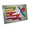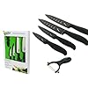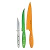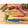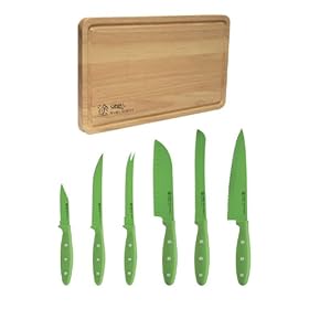 Ginsu 6 Piece Nuri Green Cutlery Set with Bonus Cutting Board: Kitchen & Dining. The fine-edge Santoku knife will require periodic sharpening. Set Includes 8-Inch Chef's Knife Known as the most versatile of all knives, the chef's knife may be used to peel, trim, pare, slice, dice, and chop. 8-Inch Bread Knife Known for its long, serrated edge, the bread knife is designed to cut through bread crusts. Ginsu 6-piece knife set. View larger. Serrated blade performs like a fine-edge knife and never needs to be sharpened. View larger. 6-Piece Knife Set with Bonus Cutting Board Ginsu Nuri is a line of nonstick kitchen cutlery that combines an Always Sharp Never Needs Sharpening edge with a nonstick coating on the blade for superb cutting performance. The sets are available in two colors--contemporary green and purple. Key Features Nonstick-coated blades: each blade is coated with a silicone-based nonstick coating, which aids in food not sticking to the blade during cutting and makes cleaning the blades much easier. Always Sharp blades with symmetric edge technology: The blade has the serrated blade pattern, which is mirrored on the opposite side, for a blade that performs like a fine-edge knife without the need to ever be sharpened. This also allows the knife to be used by both right- and left-handed users. Soft-grip handles: Made from heat- and water-resistant thermoplastic rubber, the handle fits smoothly in your hand. The soft grip adds slip-resistant control, as well as comfort to the handle. Bonus hardwood cutting board: the cutting board protects your countertop and your knives from damage during cutting and slicing. Proper Care Ginsu Nuri knives are hand-wash only, and the serrated edges will never need sharping. The length of the blade also makes it useful for cutting through larger fruits such as watermelon and cantaloupe. 7-Inch Santoku Knife A traditional Asian-style knife that excels in chopping, slicing, and making paper-thin c[5310] This 6 pc cutlery Nuri set from Ginsu includes an 8 inch chef's knife, an 8 inch bread knife, a 7 inch santoku blade, 5 inch utility knife, 5 inch tomato knife and a 3 inch paring knife.