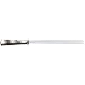 Global G-38 - 10 inch, 26cm Diamond Sharpening Steel: Kitchen & Dining. Like Global's signature knife handles, the steel's handle is molded for comfort and dimpled for a safe grip. Although steels often are touted as sharpening tools, few actually sharpen knife blades, but they do perform the vital task of realigning, or resetting, edges, which bend when contacting a cutting surface or other hard object. Because this tool's chrome/vanadium stainless-steel rod contains hundreds of thousands of diamond particles, it's hard enough to somewhat sharpen a blade. Using this steel won't replace a professional sharpening job, which proceeds from coarse grinding to ever-finer grinding at tightly controlled angles. However, it will lengthen intervals between sharpenings better than a steel without diamonds because it accomplishes the final task of a professional sharpening, which is polishing the edge to a fine point. Exceptionally well made, this tool's rod has a solid core and has been plated with hard chrome for additional resistance to abrasion and to extend its life. Because the rod is a 3/4-inch-wide oval, it exposes more surface and works quicker than a cylindrical rod. The rule is that a steel should be at least as long as the knife blade being drawn across it, and this steel's 10-inch rod is long enough for most household knives.