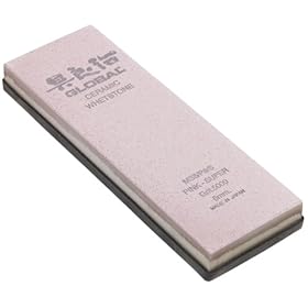Global MS5/P&S - Ceramic Whetstone, Fine Grit: Kitchen & Dining. It measures 8-1/4 inches long, 2-3/4 inches wide, and 7/8 inch thick. One of three Global whetstones of different grit ratings, this pink one is Grit 5000 for finely honing nearly sharp knife edges just before they're used. It's made of hardened ceramic powder for quick, easy work and can be used immediately after wetting—-there's no need for a lengthy submersion in water. Attached to the whetstone is a porcelain slab for rigidity. The whetstone rests in a removable, rubber-like plastic base to prevent slippage while you use it. Instructions and diagrams for proper honing accompany the whetstone.