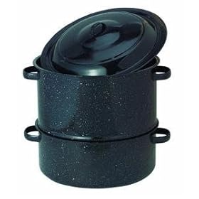 Granite Ware 19-Quart Enamel-on-Steel 2-Tier Clam-and-Lobster Steamer: Kitchen & Dining. In addition to its heavy-duty carbon-steel construction for fast, even heating, the pot features a PFOA-free, non-porous, porcelain-enamel coating that resists staining and that won't burn, won't trap odors or food particles, and won't react with foods, which means authentic, unaltered flavors and delicious results. Sure to be a treasured piece when gathering with friends and family, this three-piece steamer set supplies a lower pot that contains water for boiling, a steamer pot for steaming food, and a lid. Measuring 16-1/5 by 8-3/4 by 14-1/4 inches, the extra-large steamer provides a wide base for stability and a generous 19-quart capacity. Use it for cooking up clams, corn on the cob, crabs, crawfish, lobster, and other favorites over a campfire at the beach or at home on a standard electric or gas stove for festive cooking any time of year. The cookware provides side loop handles on both the base and the upper steamer body, while its secure-fitting lid with a loop handle helps trap heat, moisture, and nutrients.